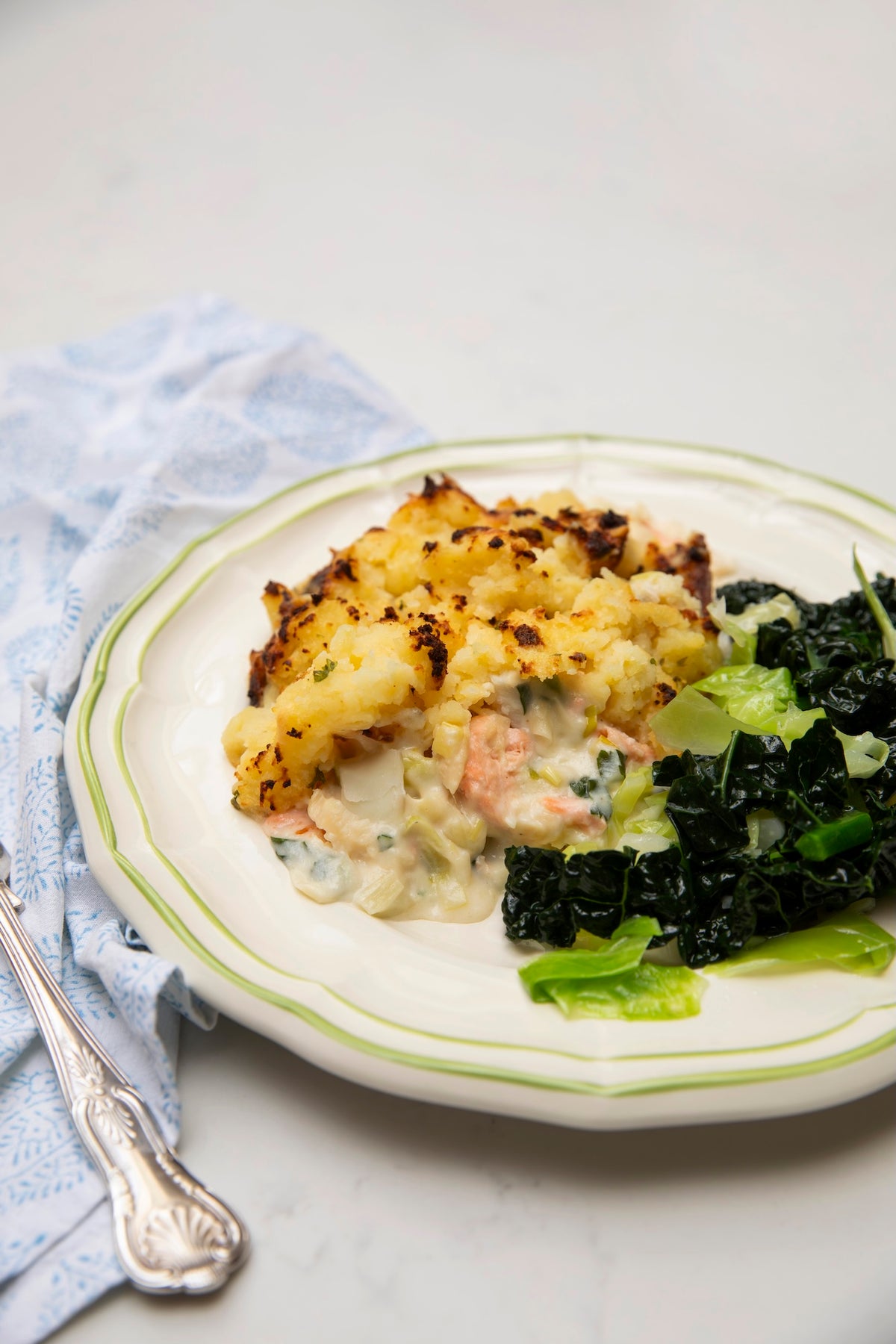 Generously filled with sustainably sourced smoked haddock, cod and salmon, combined with sweet leeks in a rich and creamy sauce. Topped with buttery mashed potato and a sprinkling of Cheddar cheese.